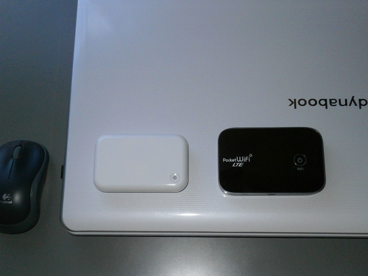 左の白いのが従来型の端末で、右の黒くて一回りサイズが大きいのが現時点で主流のLTE端末です。マウスと同じくらいの大きさです。